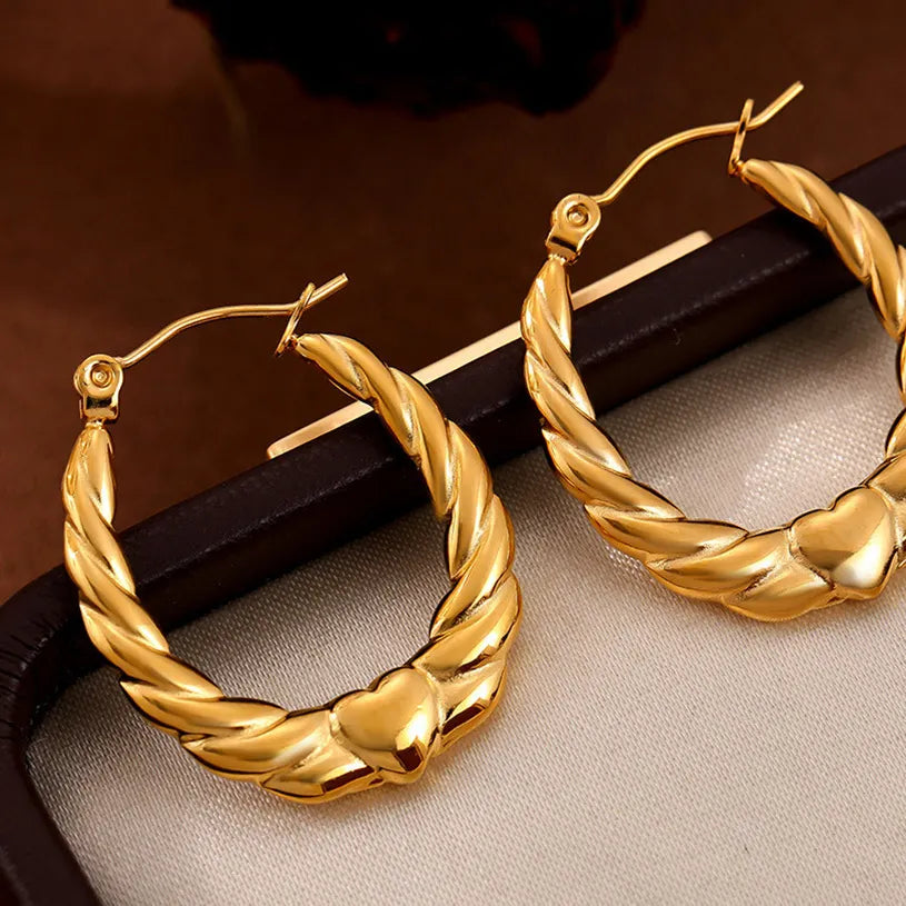 Chic with a subtle twist, the Celine Earrings feature a C-shaped hoop design with a delicate heart detail and elegant twist texture. Compact yet striking, these small hoops are crafted in hypoallergenic, waterproof PVD gold plating for a radiant, non-tarnish finish. A romantic update to your everyday essentials—effortlessly stylish, endlessly versatile