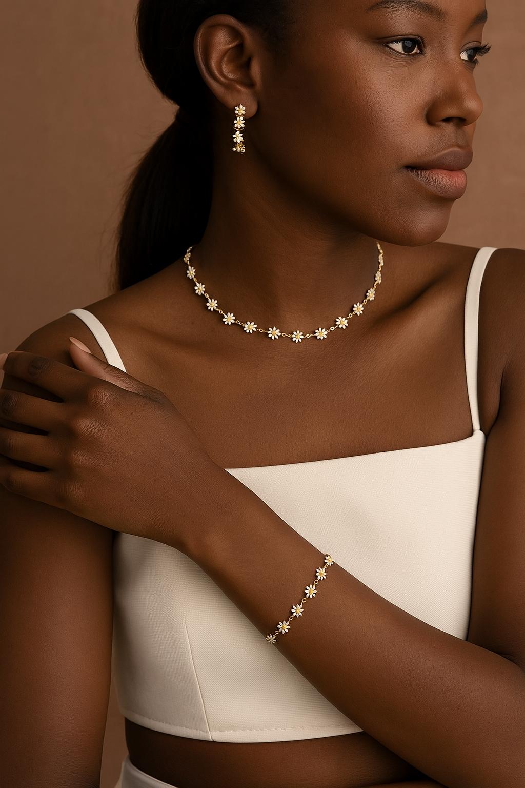 Introducing The Deborah Bracelet, part of the elegant and sophisticated Deborah Set. Inspired by daisies, this collection will remind you to bloom boldly and glow effortlessly. Perfect for warm days and golden hour, indulge in the luxury of this exclusive set. Embrace sunshine and sophistication with The Deborah Bracelet.